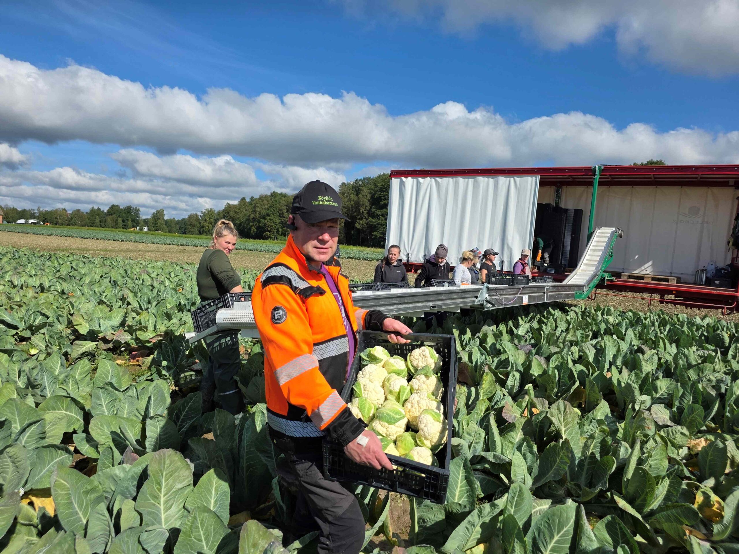 – Saimme juhannuksen alla ranskalaisen Delecroix-merkkisen korjuuvaunun. Siihen on kiinnitetty 12 metriä pitkä hihna, jolle työntekijät asettelevat leikkaamansa ja siistimänsä kukkakaalit, selvittää Kasvis-Kartanon toimitusjohtaja Veli-Pekka Suni.