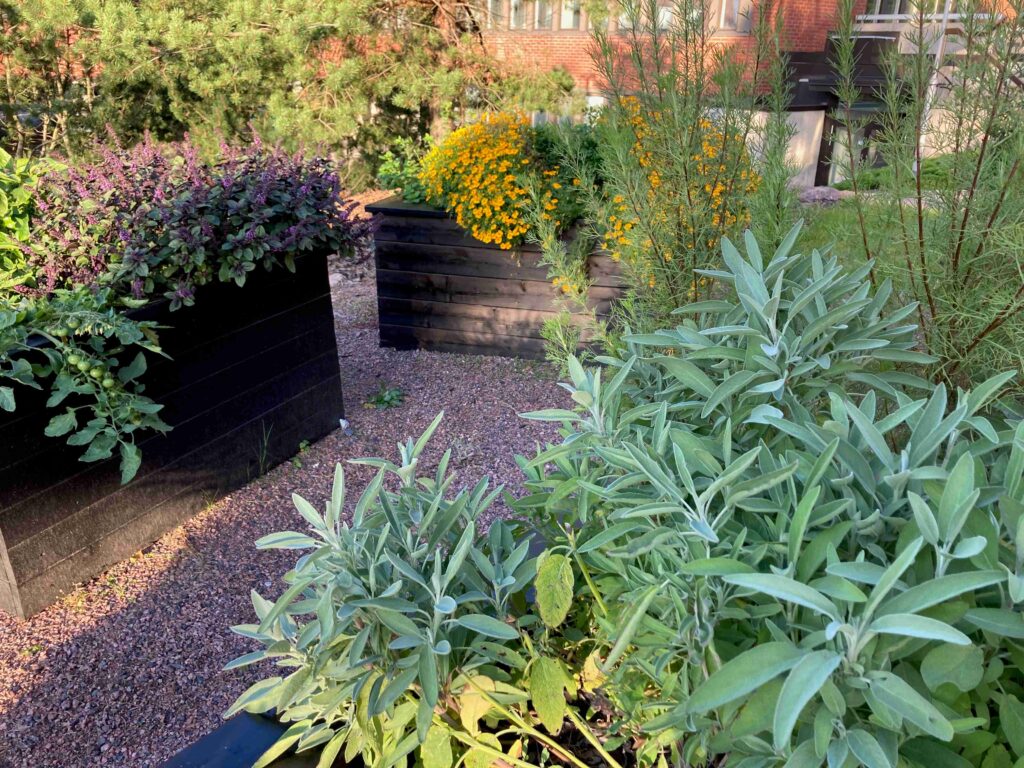Aallonharjan Puutarhakerhossa puutarha on perustettu istutuslaatikoihin kiinteistön vehreälle ulkoterasille. Kuva Lea Rauta.